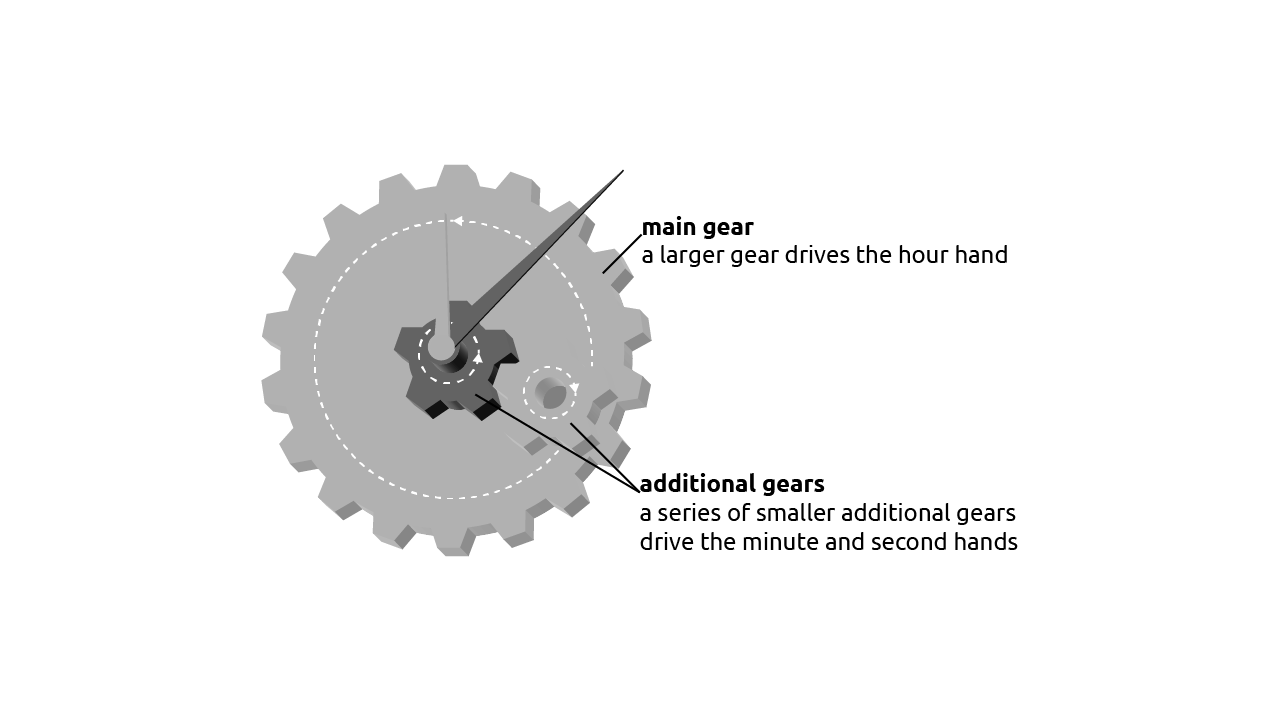 A clock is a device which is used to measure and show time. A series of gears control the three hands of the clock. These hands move at different speeds, depending on how far the gear's teeth are from the central axle. Most clocks have an hour hand, a minute hand, and a second hand. The second hand's gear is the smallest and is constantly moving. The minute hand is of medium size, and its gear has a circumferencethe measurement of the distance around the outside of a circular shape is 60 times as large as the second hand's gear. The hour hand moves even more slowly; it rotates to the next hour number as the minute hand makes one full rotation around the clock. *Louisiana Tech University, 2016